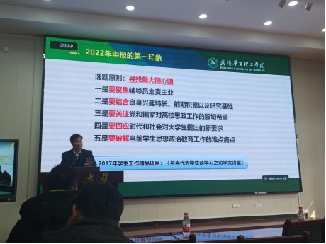 讲座伊始,张亮副教授紧扣“学生工作品牌培育与申报”这一主题,结合自身经历,从“2016年以来的基本情况”、“2022年申报的总体印象”、“学生工作品牌培育的体会”三个方面系统梳理了近年来我省高校学生工作品牌申报的基本特征,畅谈了对学生工作品牌培育与创新的现实体会。他指出,高校辅导员要立足自身工作职责开展工作实践与理论研究,通过学生工作品牌、辅导员工作室等平台建设助力辅导员专业化、职业化发展,助力学生成长成才。