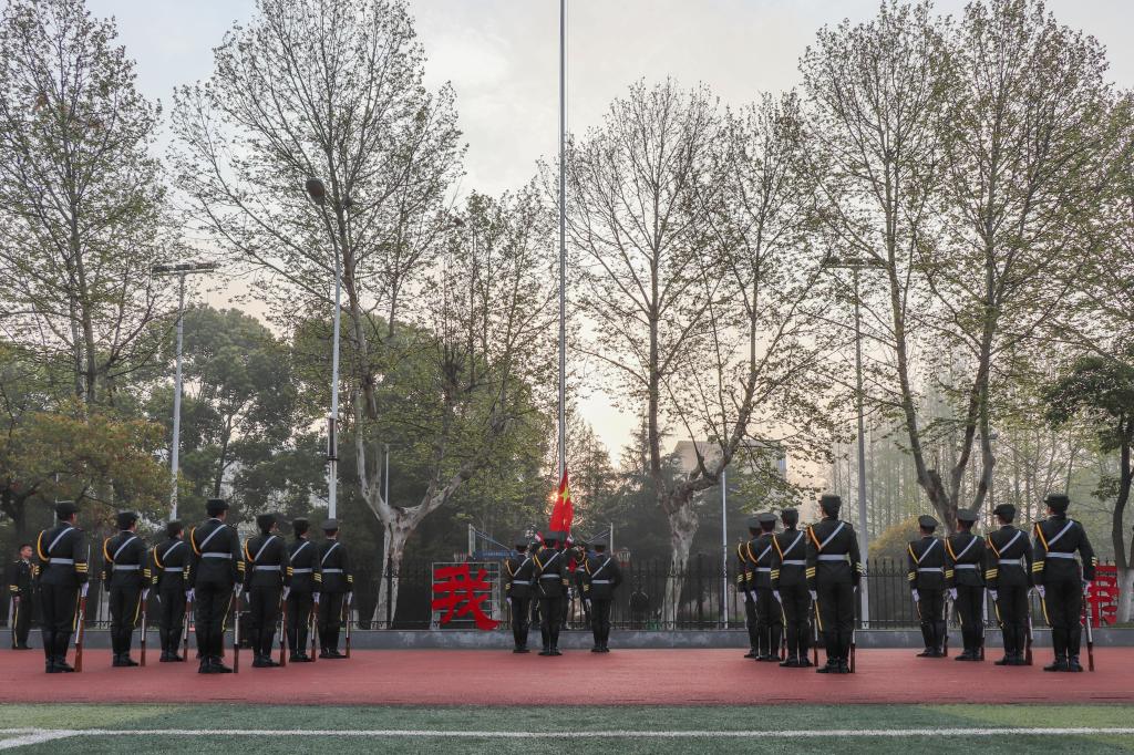 首先,国旗护卫队的成员们迎着朝阳,踏着整齐的步伐,庄严的护卫五星红旗进场。7时整,在嘹亮雄浑的国歌声中,五星红旗冉冉升起,全体师生齐唱国歌,行注目礼,升旗仪式到达高潮。