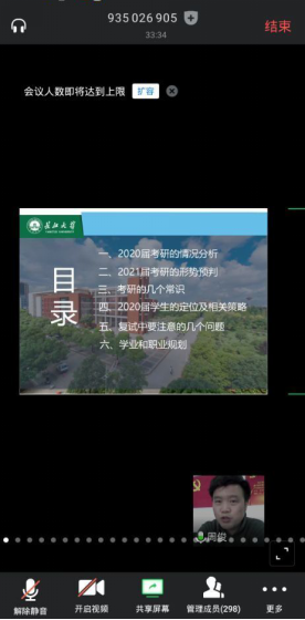 (通讯员 何儒权)疫情时期,2020届考研学生如何做好线上复试、调剂择校?2021届学生如何把握考研、就业形势,使之尽早找准定位?3月12日下午2点半,城建学院通过腾讯会议线上召开了2020届学生考研暨2021届学生学业规划指导会议,院党委副书记周俊老师担任主讲,城建学院及学校其他学院学生、辅导员等共300人聆听了讲座。