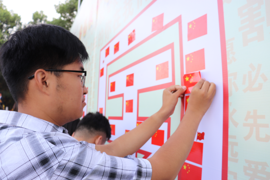 7点整,升国旗仪式正式开始。全院师生高唱国歌,面向国旗行注目礼,共同见证国庆70周年之际的五星红旗飘扬在长大校园。紧接着,在第十三期青马班学员代表的领诵下,大家齐声朗诵《少年中国说》选段:少年智则国智,少年富则国富,少年强则国强……通过诵读经典将长大师生的爱国热忱引向高潮。在重温入团誓词和合唱《我和我的祖国》之后,进入本次升国旗活动的最后一项活动——“青春告白祖国”仪式。学校和机关领导、学院师生代表依次在印有“70”和“中国”的告白墙上贴下五星红旗,表达爱国情愫。