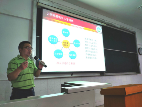 设计研究院基本情况,阐述了土木工程、给排水工程、建筑学、工程管理、城乡规划五大本科专业学科交叉、文理交融的学科群特点。在教学特色方面,他指出,学院土木工程专业是省级重点专业,并通过教育部专业认证,已经和国际接轨。同时,学院的工学交替、体验建造等活动持续开展,已成为学院培养应用型工程师的鲜明教学特色。最后,他代表学院再次表达了对家长和新生的欢迎,勉励同学们励志求学、努力成才。