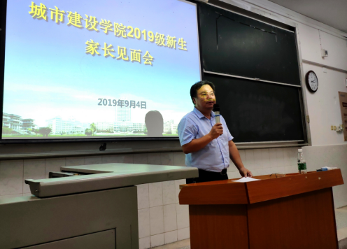 又迎来了来自全国各地的2019级新生集中报到入学时刻。为了在开学报到之际充分做好家校联系,尽快让学生适应大学生活,让家长更加了解学校情况,9月4日晚7点整,城建学院在西校区5教215召开2019级新生家长见面会,近200名学生家长相聚一堂,现场聆听讲解、充分沟通。学院全体领导、系主任、班主任和辅导员老师出席会议。会议由2018级辅导员魏民生主持。