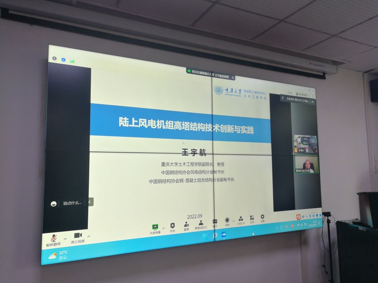 在9教208会议室举行了2022年长江城建讲坛第十八讲的学术讲座。重庆大学土木工程学院副院长,博士生导师,中国钢结构协会风电结构分会秘书长、钢-混凝土组合结构分会副秘书长,重庆市青年专家工作室首席专家,《建筑科学与工程学报》编委,以及霍英东青年教师基金、国家优秀青年科学基金获得者王宇航教授做客讲坛,并为学院师生作了题为“陆上风电机组高塔结构技术创新与实践”的学术讲座,学院多位教师和研究生参加了活动。