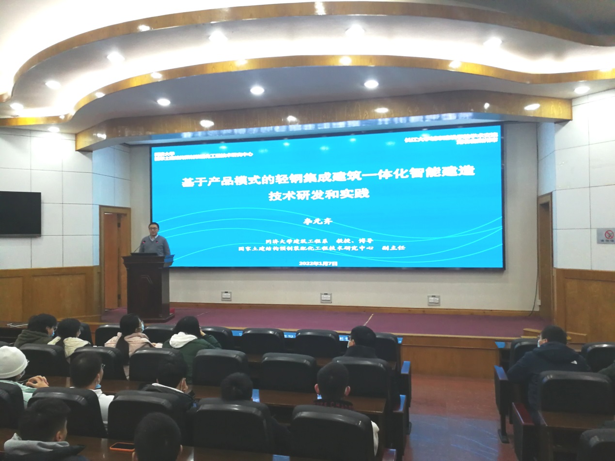 在11教报告厅举行了2022年长江城建讲坛第一讲的学术讲座,上海同济大学教授、博导,国家土建结构预制装配化工程技术研究中心副主任李元齐教授做客讲坛,并为学院师生作了题为“基于产品模式的轻钢集成建筑一体化智能建造技术研发和实践”的学术报告,学院100余名师生参加了活动。