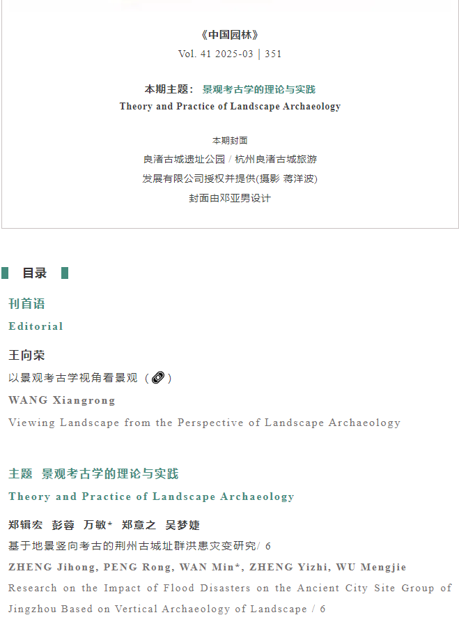 教师团队郑辑宏、彭蓉及兼职教授万敏在园林学科权威期刊《中国园林》上发表了题为《基于地景竖向考古的荆州古城址群洪患灾变研究》的学术论文。该研究聚焦荆州古城址群洪灾影响及其山水格局异化,综合运用景观考古方法、灰色系统模型及GIS空间分析技术,系统揭示了长江荆江段2500年来的高频洪水位演变规律及其对古城空间格局的深层影响。研究成果不仅为深入理解江汉平原人地关系演变提供了新的理论视角,同时也为现代城市防洪规划与景观遗产保护实践提供了重要的科学依据,具有显著的学术价值与现实意义。