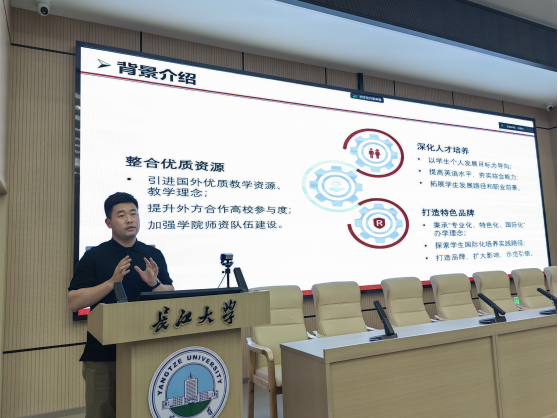 袁洪强老师向22级国土学生详细介绍了组建留学考研班(简称“国研班”)的实施方案、培养规划和选拔条件。他强调组建留学考研班是学院对中外合作办学项目的资源整合,是学院打造特色育人项目的有效途径,希望同学们能把握住机会,通过在国研班学习提升自己的综合素质能力。