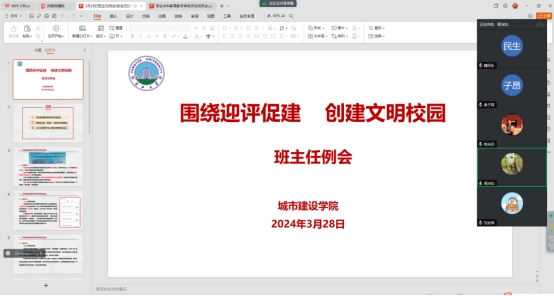 于线上召开“围绕迎评促建,创建文明校园”班主任例会,分管教学副院长黄向阳、院党委副书记周洁如、全体辅导员、班主任参会,会议由院学工办主任魏民生主持。