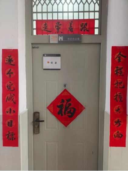 活动现场墨香四溢、气氛热烈,周国靖、张博雅、樊梦菲等同学凝神动笔、挥毫泼墨,将提前凝念好的祝福语书写于红纸之上。“全程把握大方向,逐个完成小目标”,横批“跟着党走”!这是院党委书记谌姿在日常工作会议中一再强调的办学方针。“文章投哪哪都要,数据分析好到爆”,横批“科研顺利”,书法俊秀隽逸,对子整齐易懂,红纸黑字间饱含着对师生科研工作最淳朴的祝愿。待墨渍彻底干透后,同学们将数十幅对联及“福”字带到9号教学楼,仔细张贴于办公室门上及正门两侧,为老师和同学们送去新年祝贺与温暖,共同迎接新春的到来!