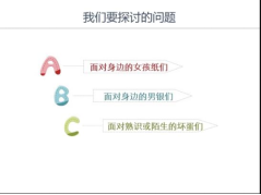 从第三个话题“面对熟识或陌生的坏蛋们”,王老师同样通过举例的形式,表明“女大学生不应成为天真的代名词”这一观点,呼吁女孩子在今后的学习生活中要提高警惕,提高安全防范意识,保护好自己,自尊自爱,让青春之花绚丽绽放。