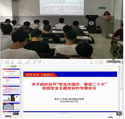 通过线下集中召开班长会议与线上分年级召开腾讯会议的形式,及时高效地开展了“安全庆国庆、喜迎二十大”校园安全主题班会。本次线下会议由学工办主任周喆老师主持,线上会议由各年级辅导员组织学生有序开展。