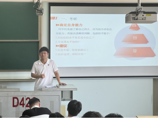 会上,就业专干杜琛向2025届毕业生详细介绍了学院近几年的考研就业情况,分析研判了2025届毕业生的就业形势。他表示无论是考公还是考研,同学们要树立目标、合理规划、逐步落实,以坚定地信念、踏实的态度、有效的行动去复习备考。对于当前求职找工作的学生,他建议同学们要把握住校招机会,及时关注校园招聘信息,积极主动投递简历,在招聘面试中不断积累经验,总结不足,以实战来提高自己的核心竞争力。
