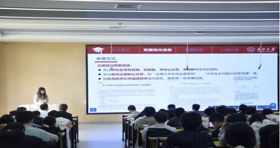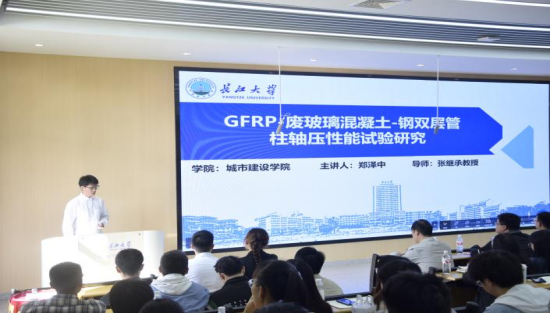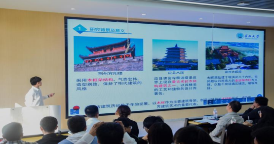 和园艺园林学院六位主讲人进行汇报。黄俊杰和郑泽中分别就《含缺陷木梁损伤破坏的声光联合表征及受弯性能退化机理研究》和《GFRP-废玻璃混凝土-钢双层管柱轴压性能试验研究》为结构工程和材料科学的结合提供了新视角。王梦丽和胡驭程分别就《水位变化对沮漳河河漫滩湿地土壤种子库的影响》和《运用于土壤重金属修复的植物的后处理方法研究》进行分享,他们的研究对环境修复和生态系统保护具有重要的实际意义。最后,金雨薇和汤雨凌分享了她们在各类竞赛中的经验与收获,鼓励同学们积极参加高质量的学科竞赛。