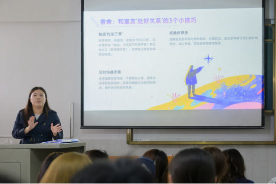 在“如何求助”方面,刘安琪详细说明了学业、宿舍、心理、安全等常见问题的应对渠道,提醒同学们熟记学校心理咨询中心、保卫处等部门的联系方式,并特别强调要严守纪律底线,杜绝考试作弊、网络谣言等不良行为。