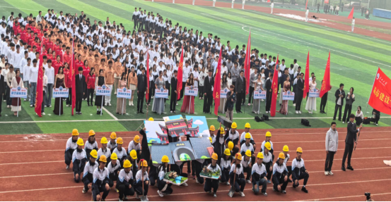开幕式上,城建学院方阵同学身着统一服装,头戴黄色安全帽,手持建筑模型,迈着整齐有力的步伐走过主席台。