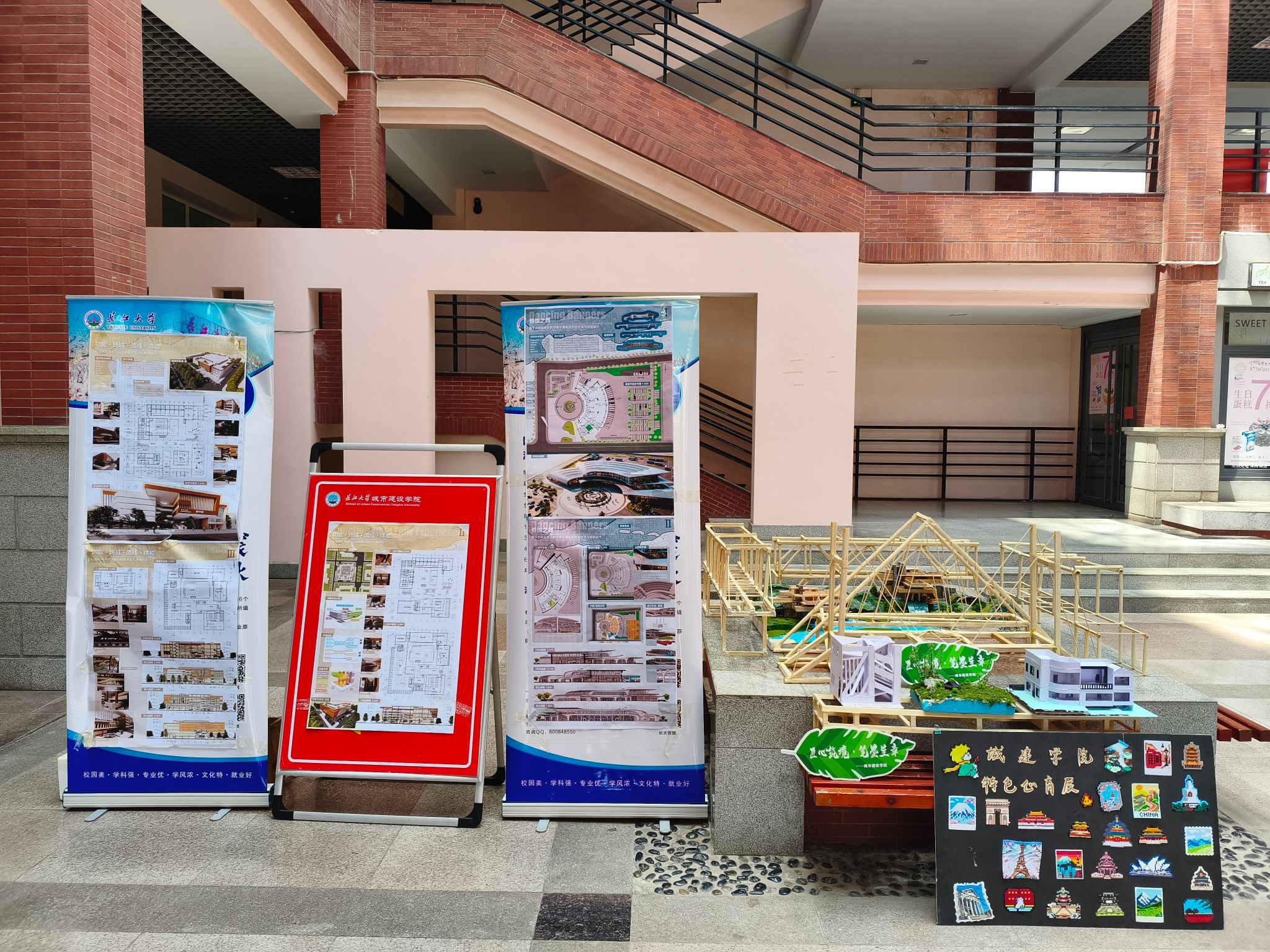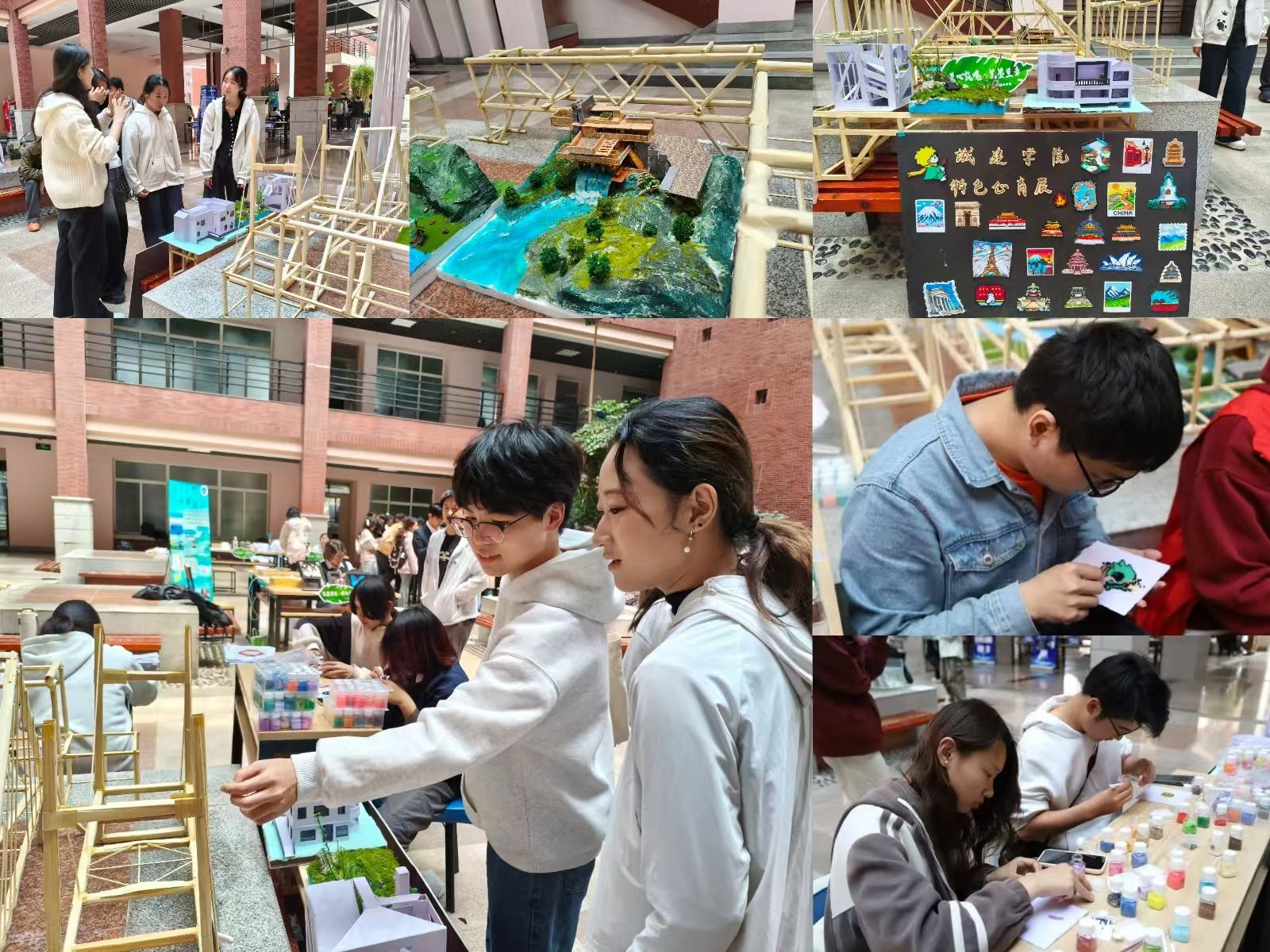 学院展区紧扣城建学科内涵,设置了三大主题板块。在工程结构模型区,竹制桁架桥梁与各类力学装置设计精巧,既符合力学原理,也展现了土木学子对结构设计的深入思考;建筑设计模型区则从赖特“流水别墅”的经典复刻,延伸至现代住宅的创新构想,通过细腻的手工将抽象的建筑美学与空间理念生动呈现;综合艺术区更是亮点纷呈,色彩缤纷的拼豆工艺生动再现了世界著名建筑地标,辅以精细的建筑手绘草图,以多元视角诠释了城建学子对工程与艺术融合的独特理解。现场特别设置了拼豆互动体验区,吸引众多观众驻足尝试,在亲手拼接的乐趣中深化了对建筑造型与色彩搭配的感知。