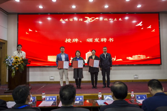 校友会成立文件,并主持了揭牌仪式和颁发聘书环节。学院校友会首任会长谌姿,副会长肖桃李、眭立、卢卫东、邢超、贺翔、邹鹏程、李雄飞,秘书长周洁如,副秘书长李先华、周莉、靳方倩上台接受聘书。