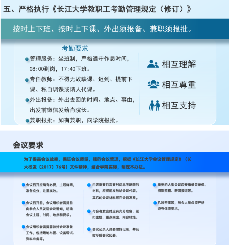 土木工程学科硕士研究生导师选聘及指导名额分配办法(试行)》等管理办法,确保学院师德师风建设有章可循,有据可依。学院党委书记谌姿、党委副书记周洁如多次在全院教职工大会上强调考勤管理和学院会议管理,要求作为一名教师,要爱岗敬业,确保考勤纪律和会议到会规范。